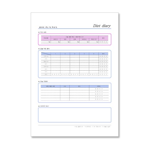 매일쓰는 간편 다이어트 일지 양식입니다. 매일의 식사량과 운동, 활동량, 체중 등을 기본적으로 기록하고 평가할 수 있도록 했으며, 하단에 간단히 일기도 작성 할 수 있도록 했습니다. 디자인이 깔끔하고 복잡하지 않아 개인의 편집 능력에 따라 얼마든지 변형이 가능합니다. 총 1페이지로 구성되어 있습니다.